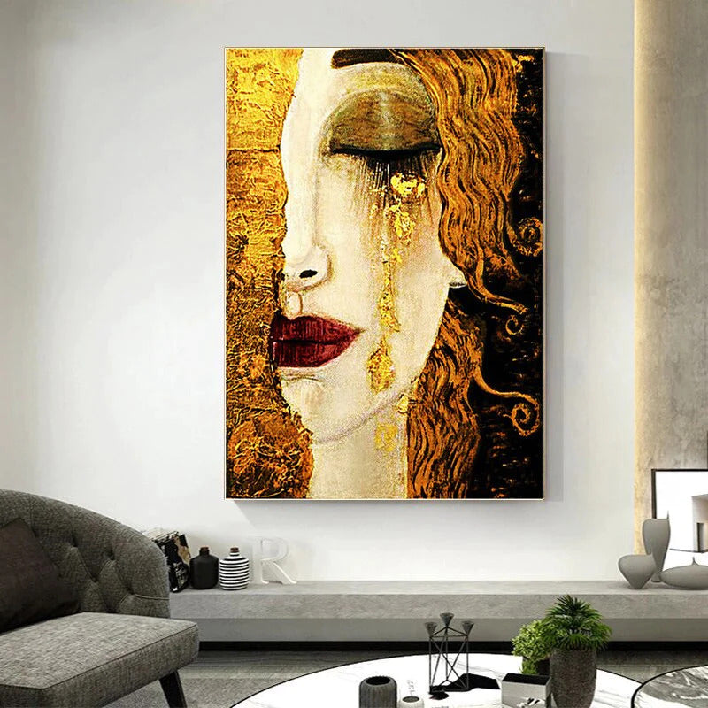The piece portrays a serene female face with closed eyes, touched by a single golden tear — a symbol of beauty born from sorrow. Rich hues of gold, bronze, and deep crimson blend harmoniously, evoking a sense of timeless sophistication.